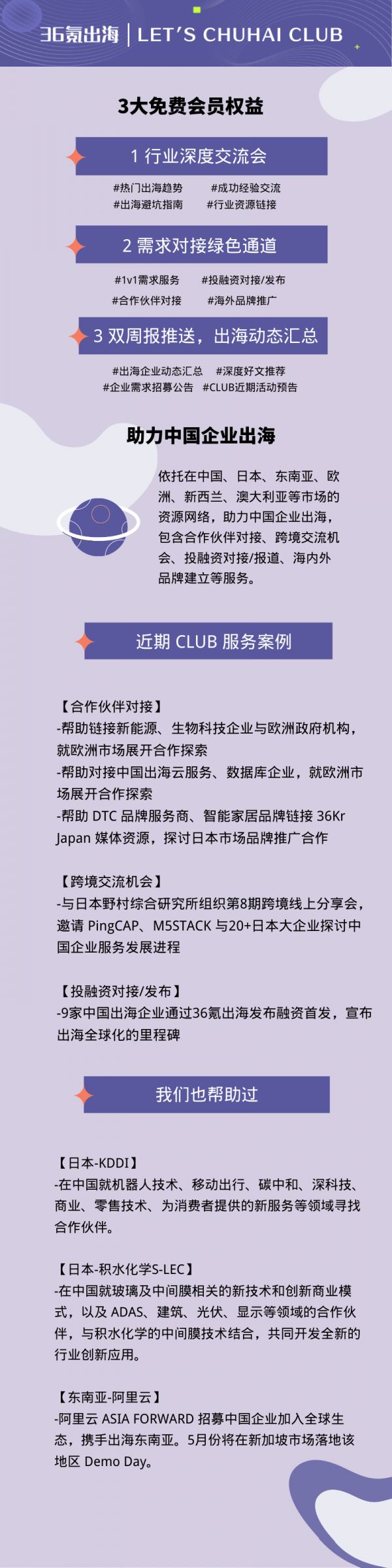 36氪出海|CLUB 持续招募企业决策者!近期,CLUB帮助会员链接出海日本/欧洲合作伙伴与行业资源