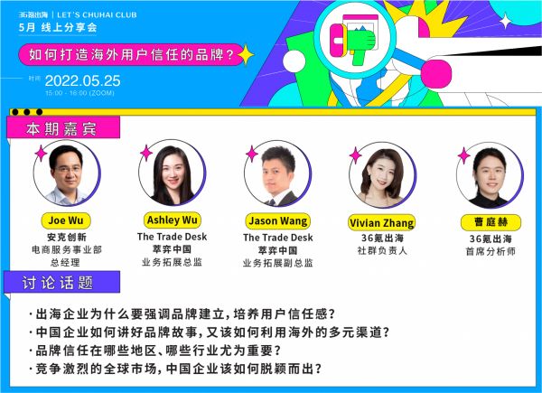 围绕出海企业如何打造海外用户信任的品牌这一主题,36氪出海旗下 LET'S CHUHAI CLUB 社群将在5月25日(星期三)下午3:00-4:00推出5月份线上闭门分享会活动,并针对以下话题进行分享讨论: