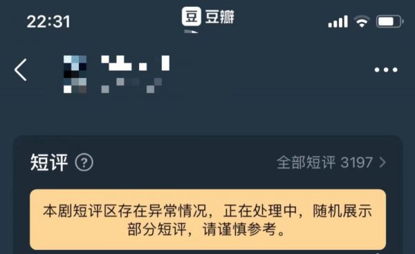 而在被水军影响的影视剧短评区域顶部,也会出现警示标识,提醒用户该影视剧短评情况异常,请大家谨慎参考。
