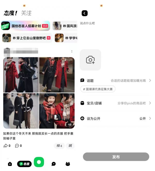 首页的第二个切页“态度”,上方同样滚动着装修类、穿搭类等话题,下方则是用户购物图文分享,为品牌和商品提供了内容种草的机会。所有用户也可以直接通过首页下方中间的绿色按钮进行内容发布。分享的内容中可以添加话题,也可以分享购买、表态过的商品和店铺。