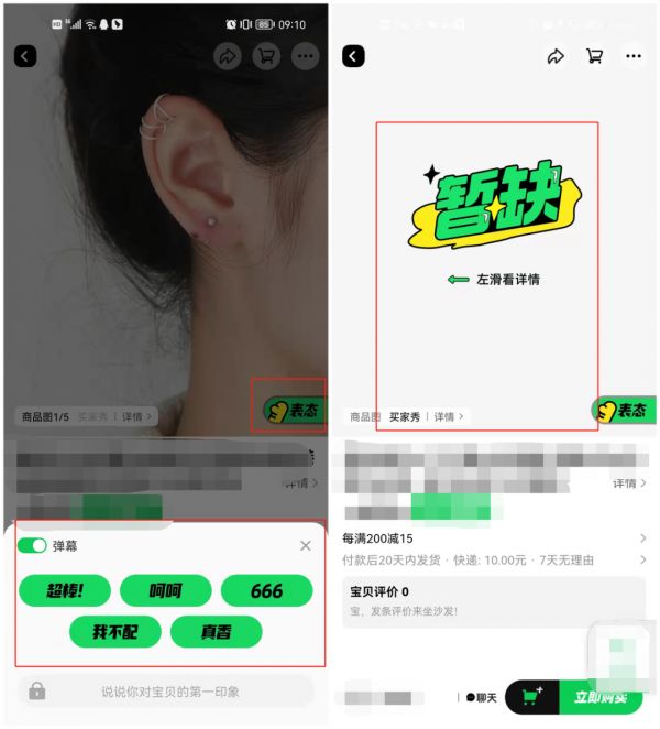 而用户则可以在商品微详情页里通过“表态”按钮,发布“超棒” “呵呵” “真香”等弹幕,表达自己对商品的态度。但部分产品还存在“买家秀”暂缺的情况。