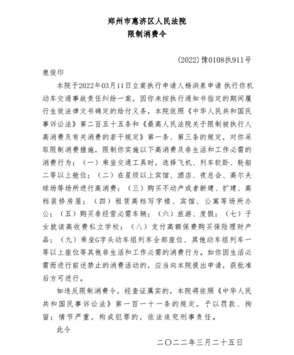 郑州市惠济区人民法院限制消费令显示,该院于2022年3月11日立案执行鹿俊印机动车交通事故责任纠纷一案,因鹿俊印未执行通知书指定的给付义务,被限制实施高消费及非生活和工作必须的消费行为。