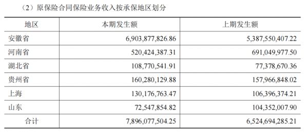 作为总部位于安徽的一家财险公司,国元农险设有安徽、河南、湖北、贵州、上海、山东等6家省分公司。其中,安徽地区是其保费收入的最大来源。以2021年为例,仅安徽一个地区就贡献了87.43%的保费收入。