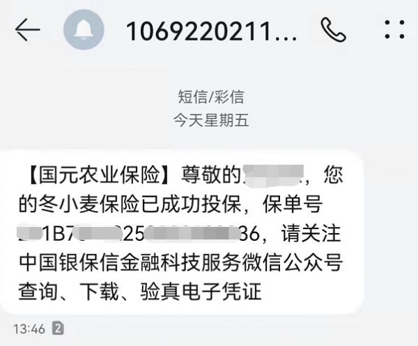 今年3月份,北京的韩先生收到一条成功投保冬小麦保险的短信,且投保人另有其人。后来,韩先生向国元农险客服投诉,质疑为何在其本人不知情的情况下使用本人手机号码并擅自购买保险,国元农险后称因信息录入有误导致。