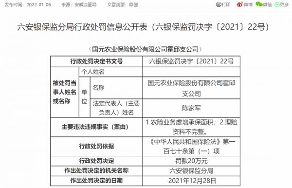 与此同时,国元农险在合规经营方面也暴露些许问题。1月6日,银保监会公示对国元农险的行政处罚信息,国元农险霍邱支公司因存在农险业务虚增承保面积,和理赔资料不完整的问题,被罚款20万元。时任国元农险霍邱支公司副经理(主持工作)的陈家军,被警告并罚款2万元。