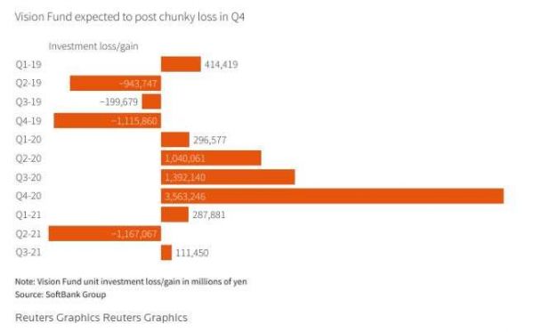 亿万富翁孙正义约40年前创设的日本软银集团将在周四公布截至今年3月末的2021财年第四季度财报,在科技股暴跌的背景下,预计其专攻科技股和风投的愿景基金将录得创纪录亏损。