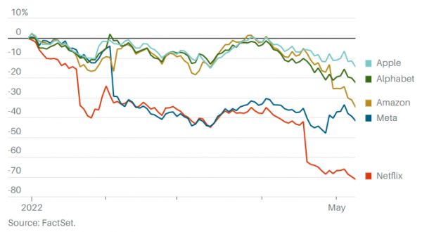 科技公司最近发布的财报暴露出它们越来越多的弱点。亚马逊和奈飞是疫情期间最大的赢家,但随着消费者支出从数字服务转向现实体验,这两家公司的核心业务都出现了大幅放缓。Meta和Alphabet的互联网广告业务也受到了电子商务收入下滑的冲击。苹果则遇到了成本上升和供应链中断的问题。