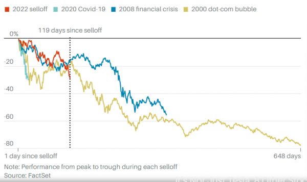 周三大幅下跌后,纳指较去年11月的峰值下跌了29%,周三也是这一轮抛售开始以来第119个交易日。在2008年和2000年抛售开始后的119个交易日里,纳指仅比峰值分别下跌了17%和19%。