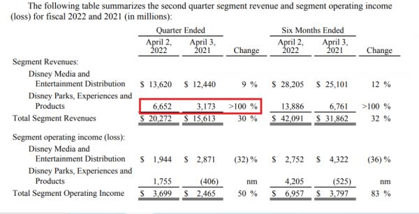 财报中提到,在2022财年,迪士尼的主题乐园与体验相关等业务,受到新冠疫情的影响已经大幅度降低。尤其是在美国国内,客流量限制的放宽大幅提升了主题乐园、酒店、餐饮的人气。
