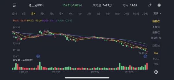 受财报影响,迪士尼5月12日股价在盘中一度跌5%,跌到两年低位99.5美元/股。截至北京时间5月13日美股收盘,迪士尼报收104.31美元/股,总市值1899亿美元,继续维持本年度以来波动式下跌的趋势。与今年以来迪士尼股票156.35美元/股的最高值相比,已跌去超35%。