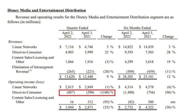 具体表现在,本财季,迪士尼旗下的流媒体“Disney+”和Hulu在生产、制作、市场营销与技术方面的支出增幅,显著大于订阅用户带来的收入增幅,也致使经营性亏损达8.87亿美元,同比扩大超100%。