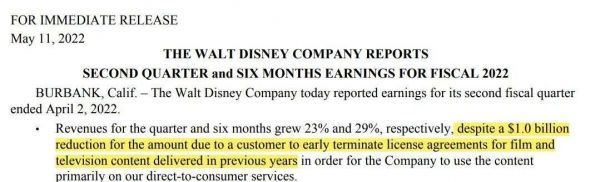 本季度,分析师对于迪士尼的业绩预期在200.3亿美元,而其实际营收则为192.49亿美元。财报中提到,“一笔对外内容授权的提前终止,使得其本季度的应得收入减少了10亿美元。”