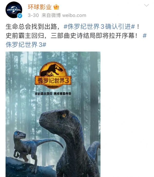(《侏罗纪世界3》早在3月份就已确定引进)