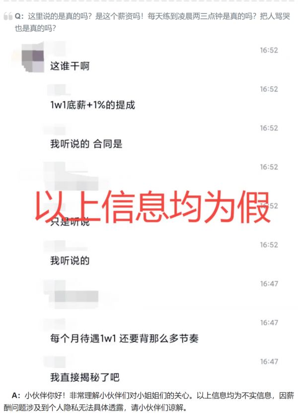 官方称,A-SOUL的培训均是以公司名义与合作机构签订长期合同,课程费用由公司承担,并且尊重、喜爱、爱护小姐姐们, 不存在所谓“霸凌”问题,而薪酬方面则称涉及个人隐私无法具体透露 。除此之外,官方表示后续企划会加强对小姐姐们工作休息时间的关注,保障她们身心健康。