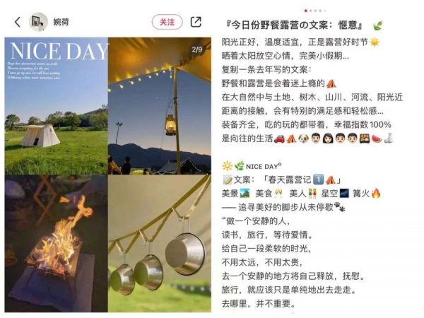 比如@婉荷 发布的一条露营笔记,仅仅是分享了自己在露营中拍下的美图,和一段浪漫的文字。很多粉丝被这段唯美文案吸引,给笔记点赞的同时在评论区留下了“抱走文案”的身影。