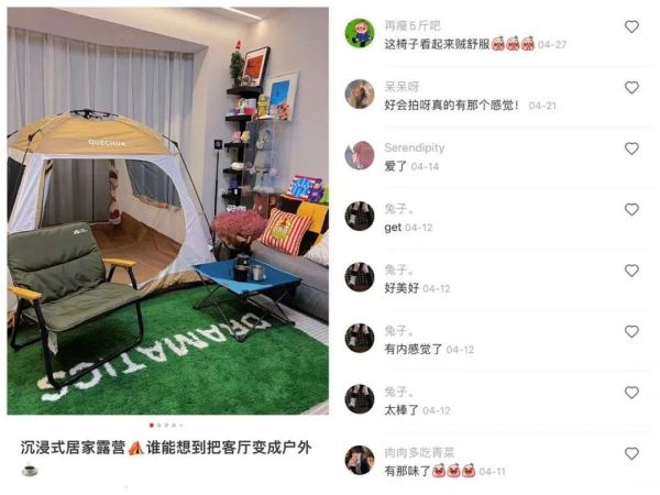 此外,还有一些博主使出奇招,将露营玩出了新花样,比如@小滴DRAMA 成功带领了一群粉丝体验“沉浸式居家露营”的快乐。他在自家的客厅内搭起了一个露营场景,泡上茶摆上折叠凳,露营的氛围感一下被拉满,很多人评论有内味了。