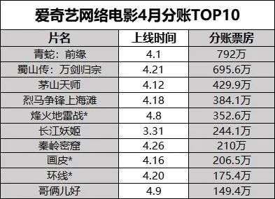 爱奇艺网络电影在4月的表现延续了今年3月的低迷态势,无一部影片单平台月分账破千万。