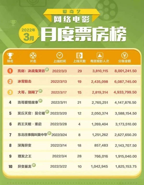 该月的爱奇艺分账亚军和季军则由《蜀山传:万剑归宗》《茅山天师》两部影片分获。这两部影片皆为传统题材的网络电影,受众群体、市场表现依旧稳定。