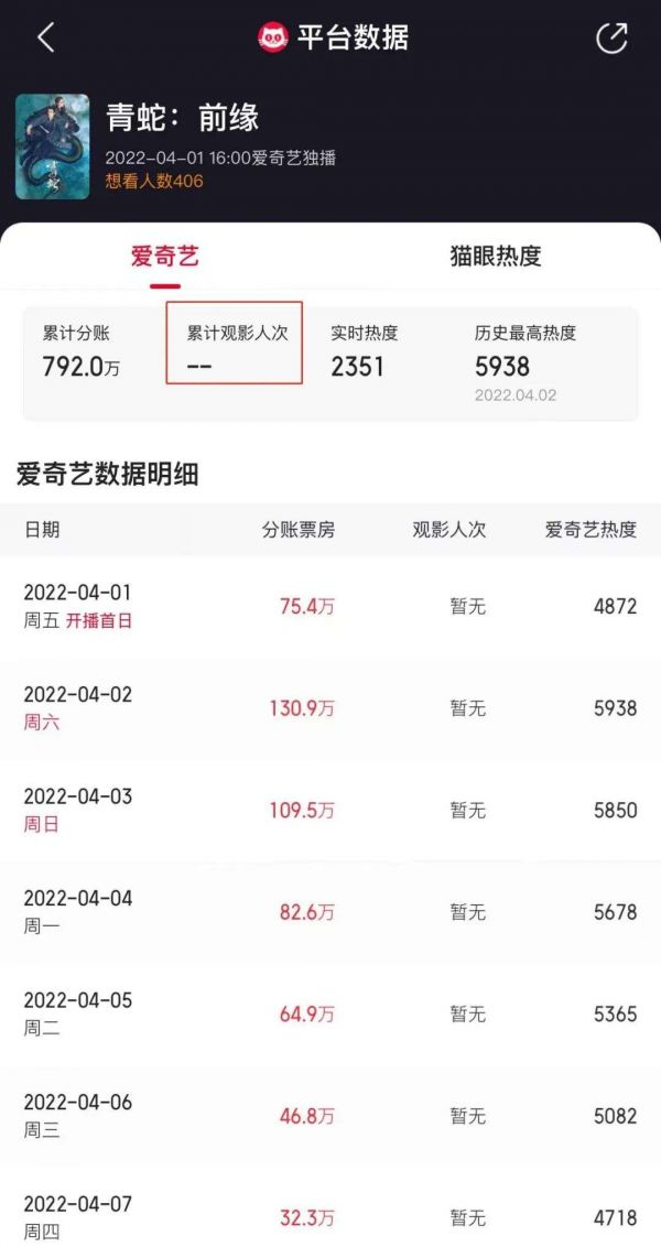 不过需要看到的是,在数据公开方面似乎出现了新的变化。根据猫眼专业版数据,自4月1日起在爱奇艺上线的新网络电影的累计观影人次已经被隐去。