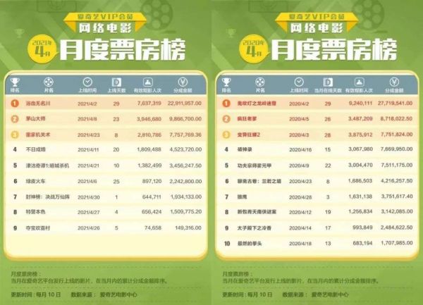 去年4月,爱奇艺仅《浴血无名川》一部影片的单月分账就达到了2200万+的水平,而2020年4月则有《鬼吹灯之龙岭迷窟》这部年度爆款,上线首月分账多达2771.9万。对比之下,已经连续两个月无千万量级新片的爱奇艺,上次见到2000万量级的项目还是在年初。