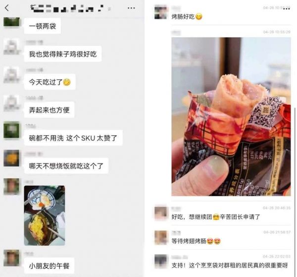 这种无需烹饪和厨具的速冻食品获得了诸多居民的好评:“支持!对群租居民很重要”,“碗都不用洗,这个SKU(最小存货单位)太赞”,复购成了团购群中的普遍呼声。烹烹袋的线下销量也很快有了起色,进入团购两周创下了一百多万元的销售额。