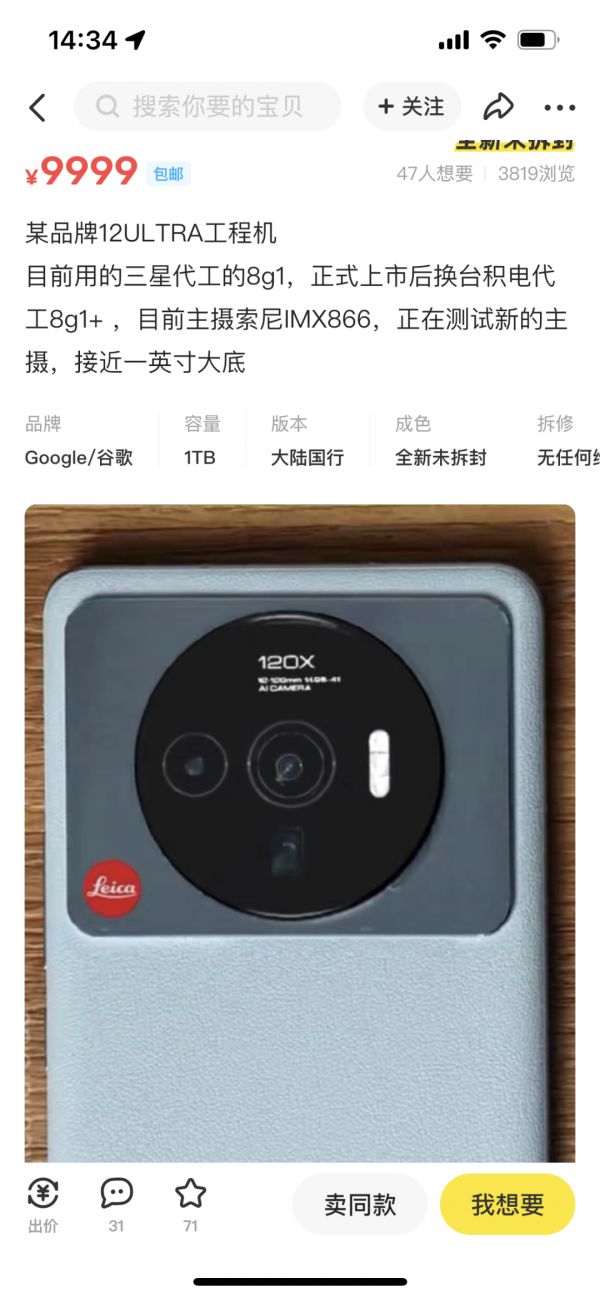 答案是会,近日在闲鱼上,一位卖家上架了一款名为某品牌12Ultra工程机,从外观和镜头模组左下角的徕卡联名logo来看,这几乎可以确认就是小米12系列的超大杯——小米12 Ultra。