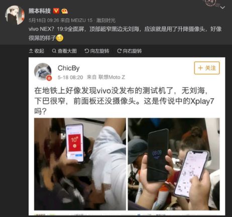 可能有些读者会跟我有一样的疑问,为什么这台小米12 Ultra会在闲鱼被人曝光呢?而且还是被曝光地如此“干净”。实际上这也算不上什么太稀奇的事情,毕竟在前两年就有各种手机在地铁上被人拍到,例如在2018年5月18日,数码博主@Chicby发布了一条“vivo全面屏新机在地铁被偷拍”的微博,迅速引发了不少数码大V的关注。在四个月前,vivo才刚刚发布全面屏概念新机APEX,“真全面屏”到来的速度之快,让各大数码爱好者为之惊叹,vivo NEX的关注度也随即上涨。