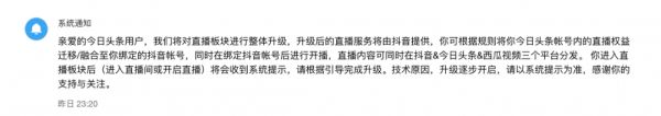 2022年5月14日晚,今日头条发布消息通知称将对直播板块进行整体升级,“升级后的直播服务将由抖音提供,”根据规则,用户的今日头条账号内的直播权益可迁移/融合至抖音账号,且抖音账号开播的内容可同时在抖音、今日头条和西瓜视频上分发。