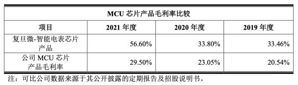 钜泉光电与复旦微MCU芯片产品毛利率比较(来源:IPO招股书)
