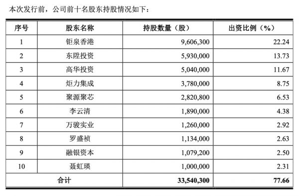 本次发行前,钜泉光电前十名股东持股情况(来源:IPO招股书)