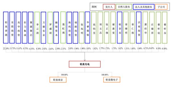 除此之外,本次发行前钜泉光电不存在国有股东,有18名外资股东,其中除了钜泉香港(22.24%)、东陞投资(13.73%)、高华投资(11.67%)、万骏实业(2.92%)之外,剩余均为自然人股东。私募基金股东则包括聚源聚芯(6.53%)、融银资本(2.5%)、华睿德银(1.85%)、欧奈而(1.62%)。