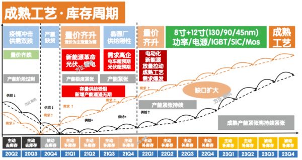 由图可以看到,成熟工艺直到2023年第二季度都是主动补库存,电动化新能源放量拉动成熟工艺需求爆发,缺口变大,产能紧张将持续。需求持续是大于供给的。“全球大趋势推动而不断增长的晶圆需求,加上半导体产业结构性转变,成熟制程还是供不应求。”联电发言人也如此说道。