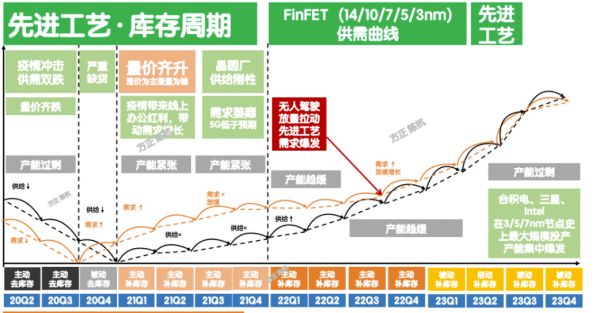 台积电、三星、英特尔最近在全球扩厂增产,预测之后先进制程上会存在产能趋缓的现象。2023年第一季度开始,先进工艺将进入被动补库存,