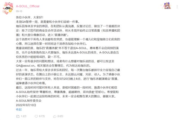 5月10日,虚拟偶像团体A-SOUL在B站发布声明称:成员珈乐因身体和学业原因进入“直播休眠”,其日常直播和大部分偶像活动也将终止。并解释称,“直播休眠”并不等于退出A-SOUL,不会启用别的演员,也不会有新角色加入替代珈乐。