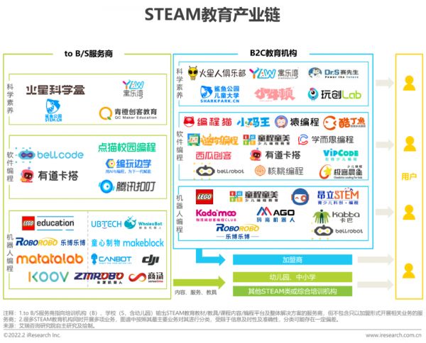 在产品和服务层面,不断有创业公司冒头,一条产业链也逐渐清晰,有ToB/S的服务商,提供科学素养、软件编程、机器人编程的内容、服务和教具,有B2C的的教育机构。