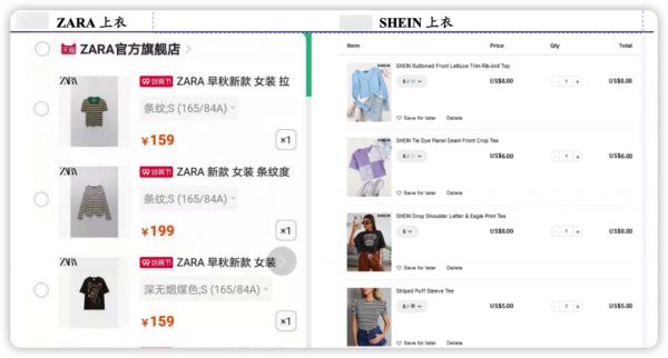 ZARA和SHEIN上衣价格对比,数据来源:天猫,SHEIN官网