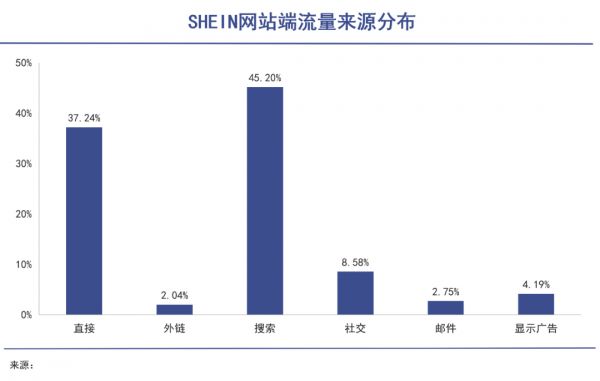 不仅有私域流量,公域流量中,至少一半以上都是自然流量。SimilarWeb数据显示,SHEIN网站端流量中,至少一半以上的用户,是直接进入其官网,或者通过搜索SHEIN,直接访问网站。