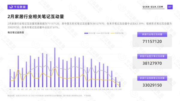 千瓜数据发布的数据显示,今年2月小红书平台家居行业笔记篇数为377458篇,相关互动量达到71157120。