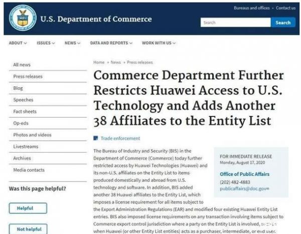 华为子公司被列入美国“实体清单”(美国商务部网站截图)
