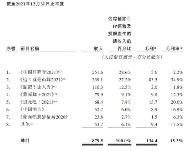 并且这活的盈利空间并不大,2021年星空华文综艺节目IP运营及授权业务的毛利率只有15.3%,这还要多亏了《这!就是街舞2021》的成功,《中国好声音2021》的毛利率只有2.2%,基本不盈利。