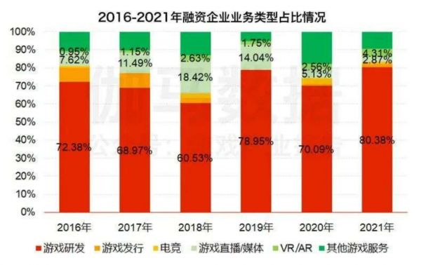 同样来自伽马数据的统计显示,过去五年近七成的游戏行业融资发生在游戏研发公司身上,其次是游戏发行、电竞、游戏直播/媒体平台,就连刚兴起不久的VR/AR硬件赛道都要比游戏手机更受资本青睐。