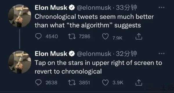 在与Twitter达成价值440亿美元的收购交易后,马斯克入主这家社交平台的脚步或已越来越近。作为Twitter极有可能的新主人,马斯克在这段时间里,也陆续喊出了诸如盈利模式转向收费订阅、放松审核、清理机器人账号等改革措施。日前,马斯克又在Twitter上发文称,按时间顺序排列的推文似乎比算法建议的好很多,并推荐网友将推文顺序设置为按时间排列。