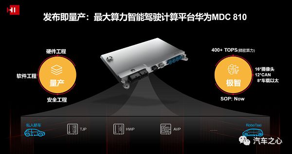 目前北汽极狐 HI 版、长城汽车沙龙机甲龙、哪吒 S、阿维塔 11 都采用了华为 MDC 平台,而华为向车企提供了 SOC 硬件、自动驾驶操作系统、车控操作系统,以及 Auto SAR 中间件。
