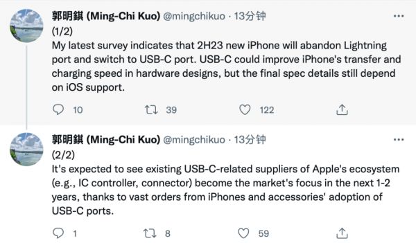 郭明錤表示,USB-C 接口将在硬件层面提高 iPhone 的数据传输和充电速度。至于产业链方面,USB-C 相关的苹果供应商将在未来两年内,成为市场的关注重点。