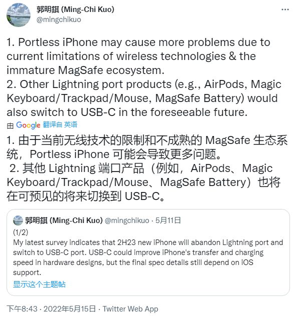 他还认为,在可预见的未来,其他基于苹果 Lightning 接口的产品 (如 AirPods、Magic Keyboard / Trackpad / Mouse、MagSafe Battery) 也将改换为 USB-C 接口。