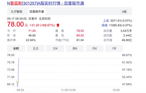 截至发稿前,普蕊斯每股涨至78元,涨幅达66.67%,总市值46亿元。