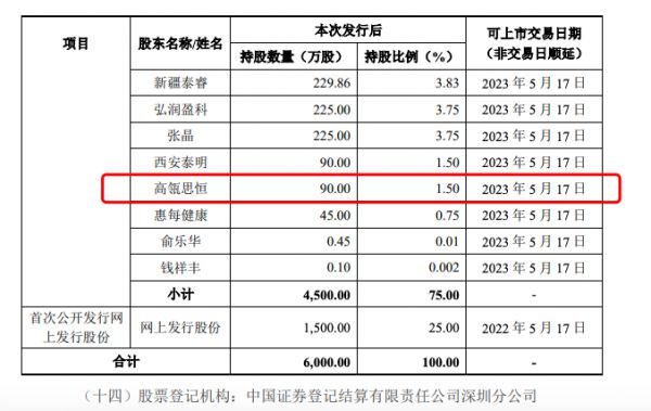本次IPO后,高瓴思恒持股90万股,持股比例为1.5%。