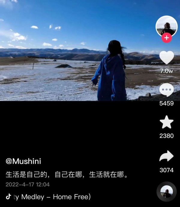 这两天刷抖音时多次碰到一个小姐姐,她只出镜、不说话,然后以自然作为背景并配一段音乐欢快地蹦跳。