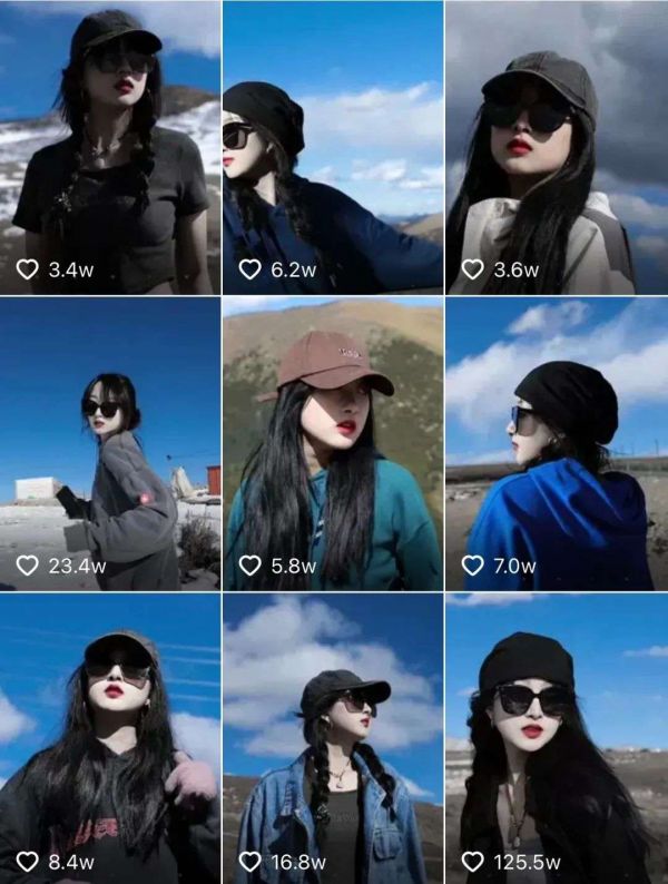 人物上,她的特点是年轻、女孩、皮肤白皙、身材姣好、大长辫、帽子、墨镜。