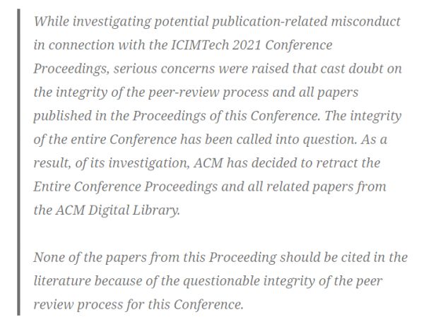 所以说,ACM不是第一次见到假的学术会议了,这次在收到真ICIMTech会议主办方的提示时,他们已经见怪不怪了,直接撤稿就完事了。